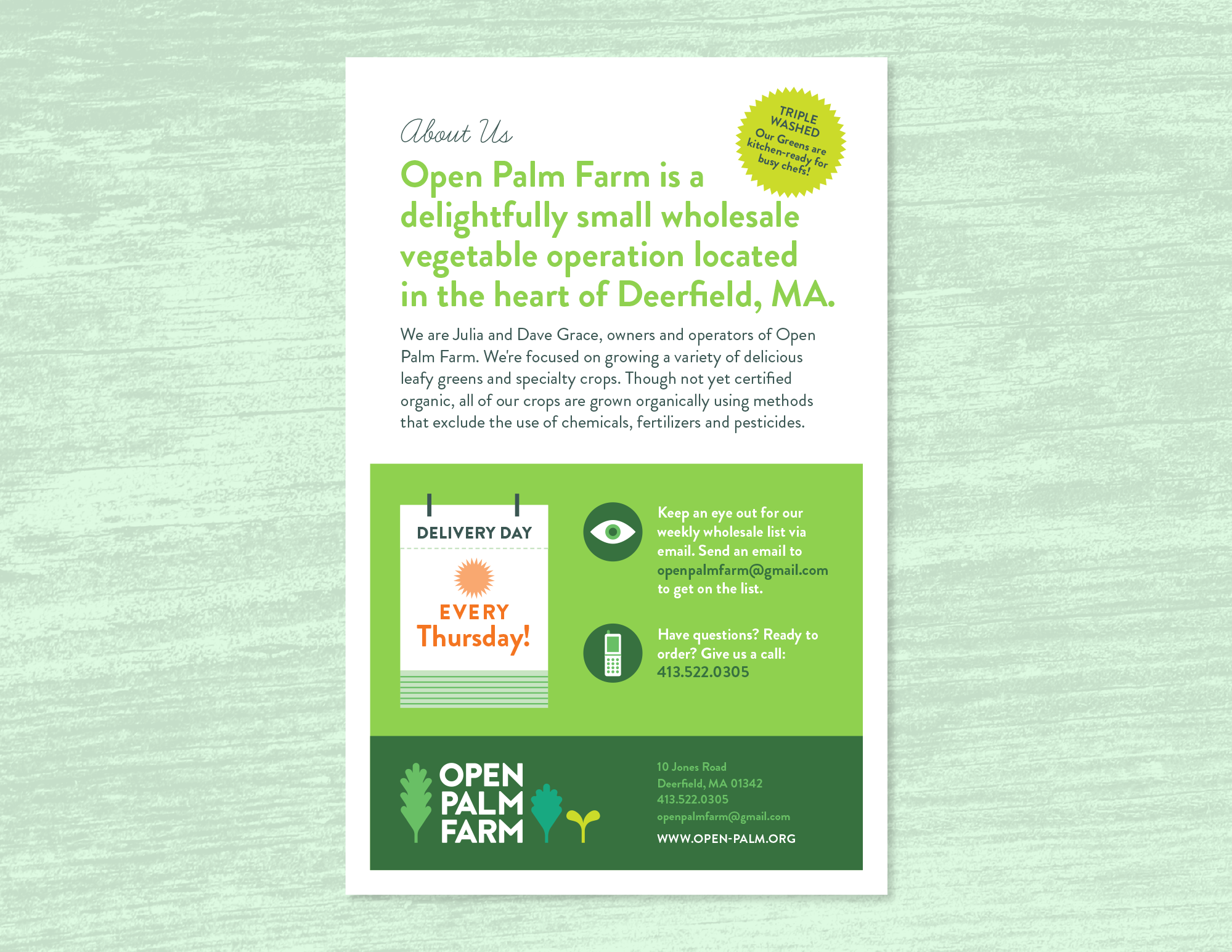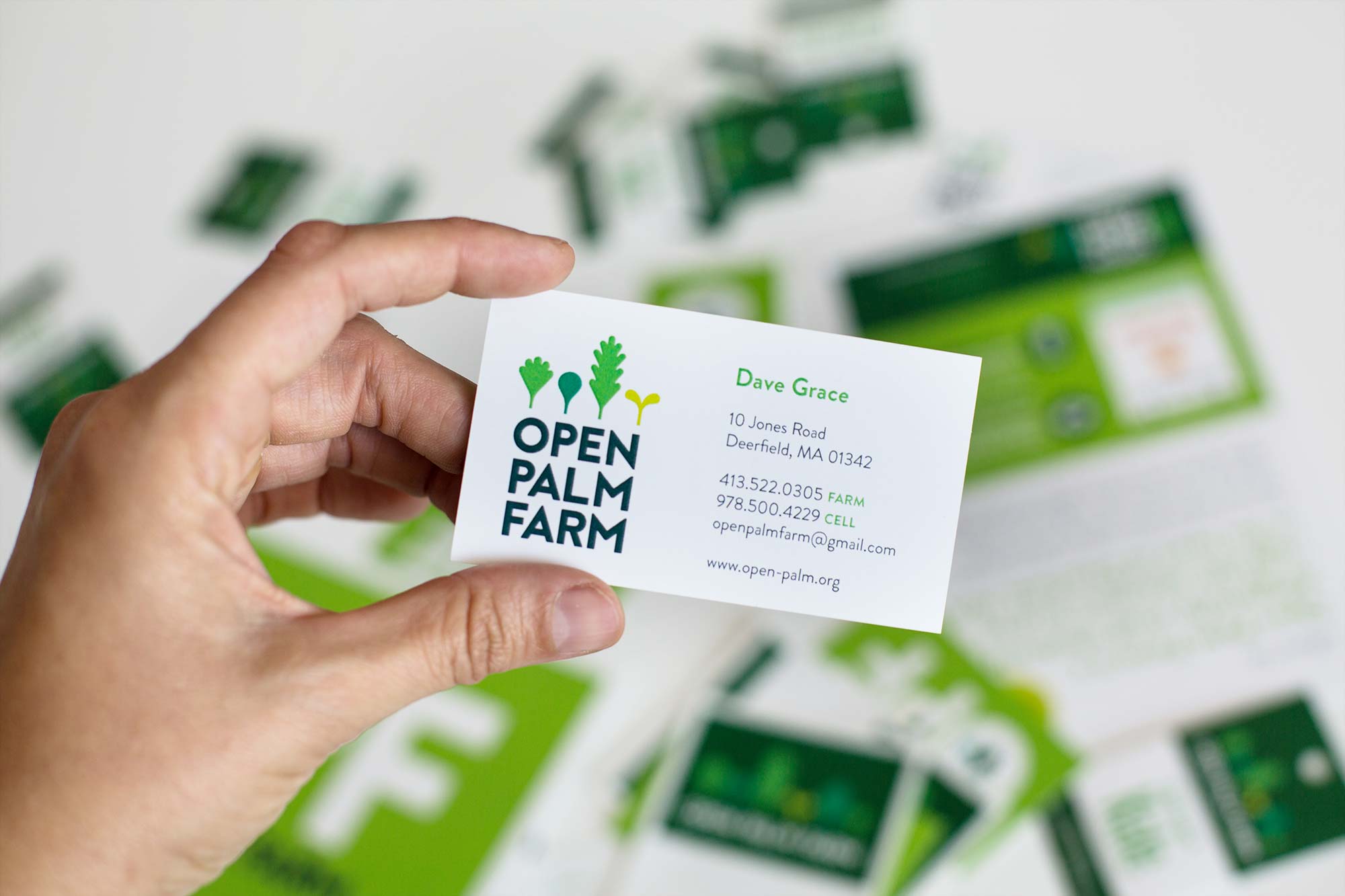 Identity and print materials for Open Palm Farm, located in Deerfield, MA.